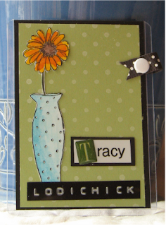 Next Saturday I am going to Syracuse to a SCS gathering. I have all my swaps done and my shoebox projects prepped. I will upload those after the event. We also have to make a name tag for the day. I have had these rigid plastic baseball card sleeves for a year now for one of those ideas that never came to life. I figured it was light weight enough to be turned into a name tag. I used a Printworks stamp and cut out the daisy vase portion of the image. I colored it in with ink and an aquapainter. The polka dots on the vase are highlighted with a white gel pen. In order to carry on the polka dot theme, I stamped the celery card stock with the Cornish Heritage Farms Polka Dots background with white craft ink. Our name tag needs to include our real name as well as our SCS name so people can better identify us. I used my label maker to print out "Tracy" but it seemed a little boring so I added an epoxy sticker letter and mounted the label onto black card stock. My SCS name is done with a Dymo label makers. I had some black and white polka dot ribbon so I attached a small tab with a white brad. I used one of those self adhesive pin backs for the back. I love the way it turned out.